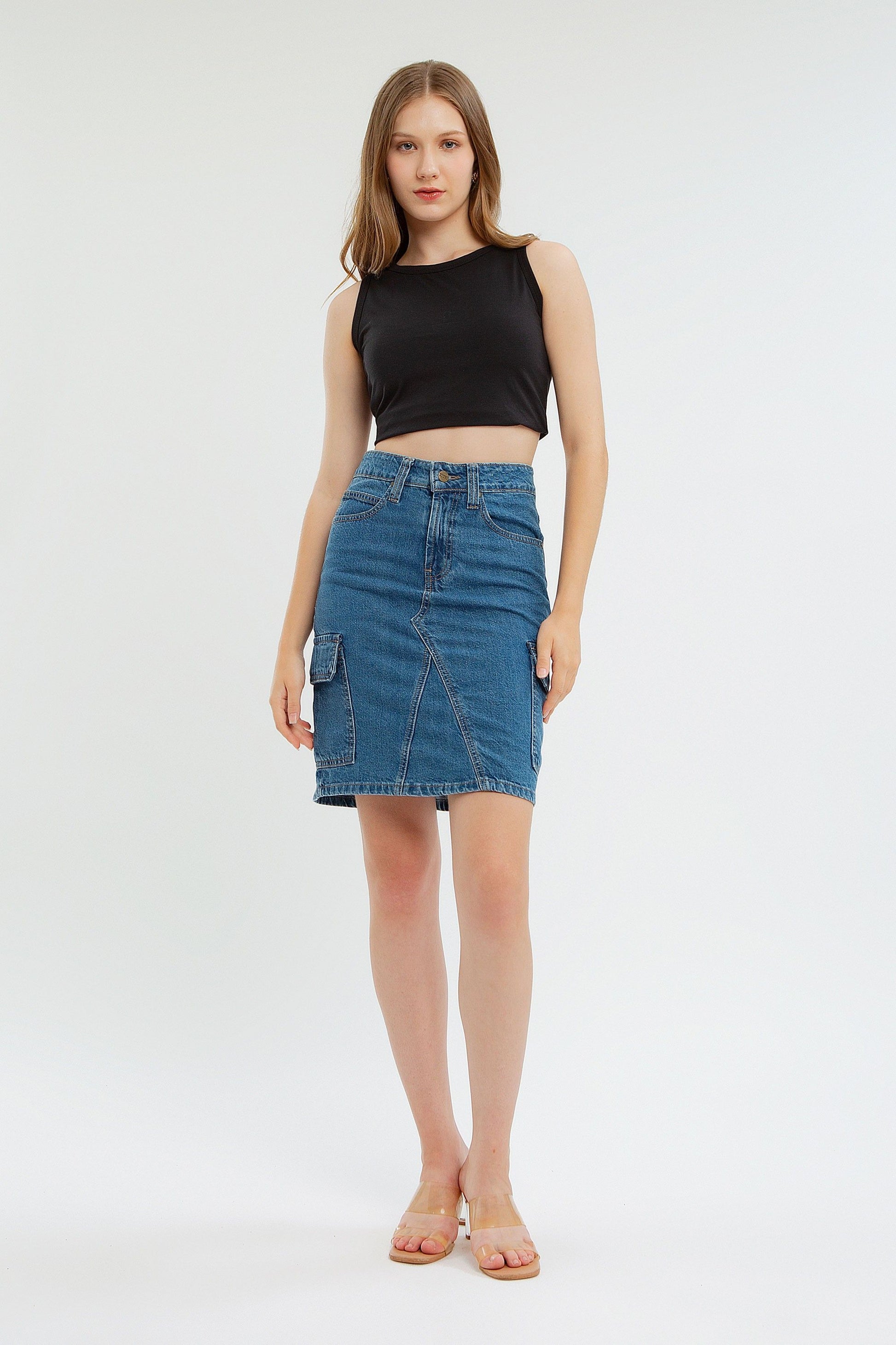Denim Cargo Skirt is one of the products that we look forward so much to share with you! Made with a non-stretch blue colored denim, this skirt is in a nice above the knee length, and in a color that is easy to pair with any top. Not to mention, we added a small slit at the back of the skirt for comfort during movement.