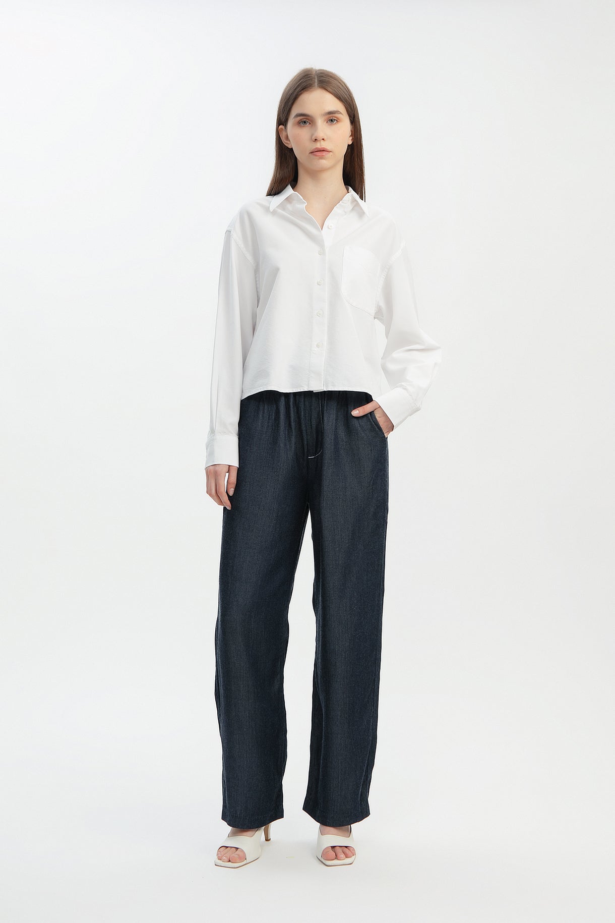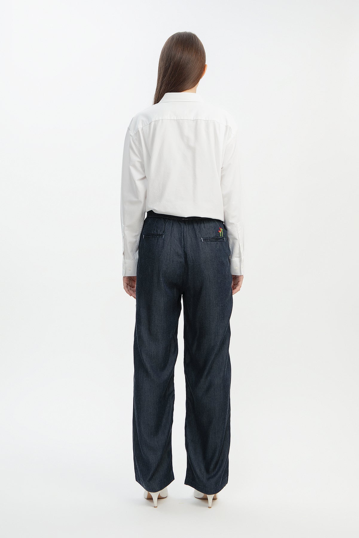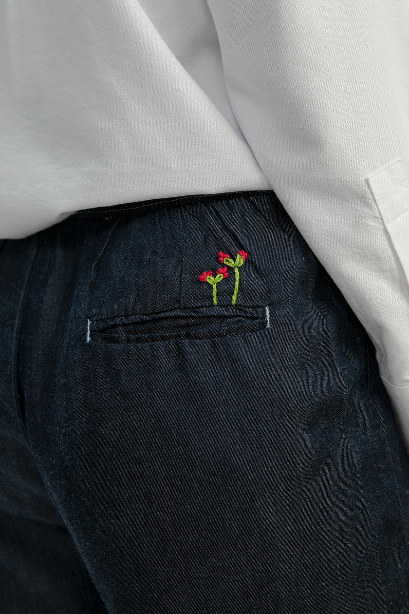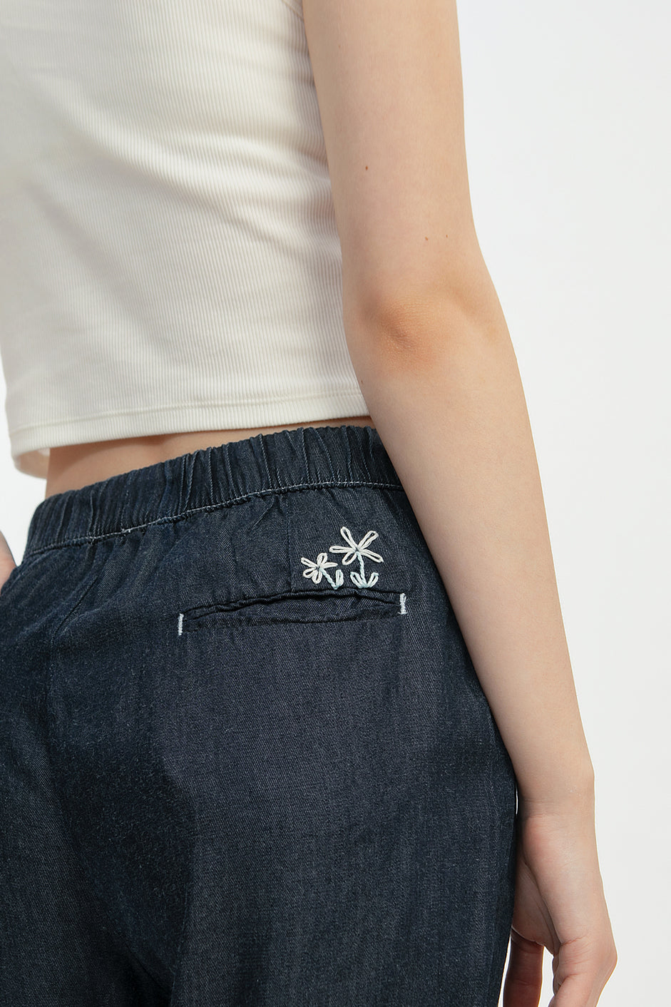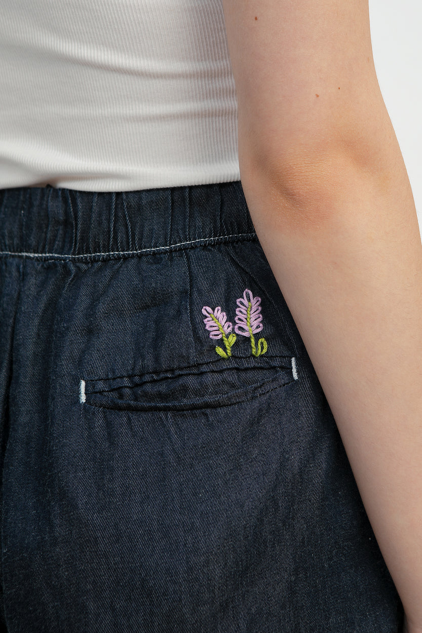 Crafted from a soft Tencel-cotton blend, this pair feels cool on the skin and flows beautifully with every step. The clean white stitch gives it a contrasting color while the tiny flower embroidery above the back pocket adds a sweet, playful charm.