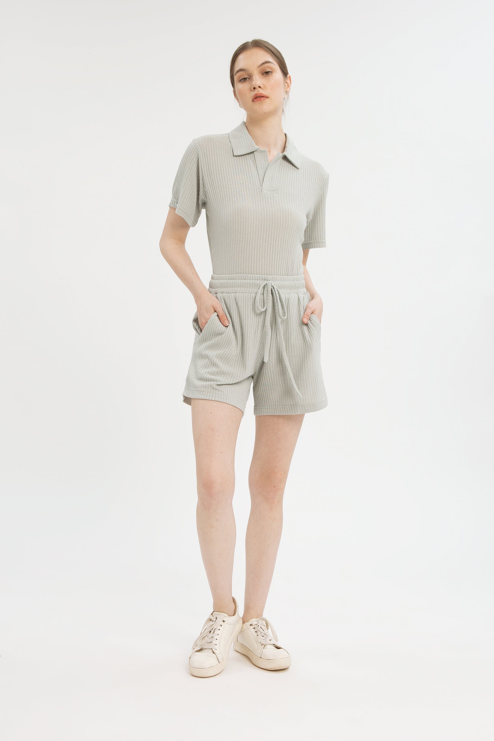 Haru is a two piece set; polo styled top made in breathable lightweight knit material and a matching bottom. With thick stretchy elastics and adjustable drawstring on the waist, the shorts are sure to give a snug yet comfortable fit. The bottom of the set also comes with two side pockets for easy storage of items.