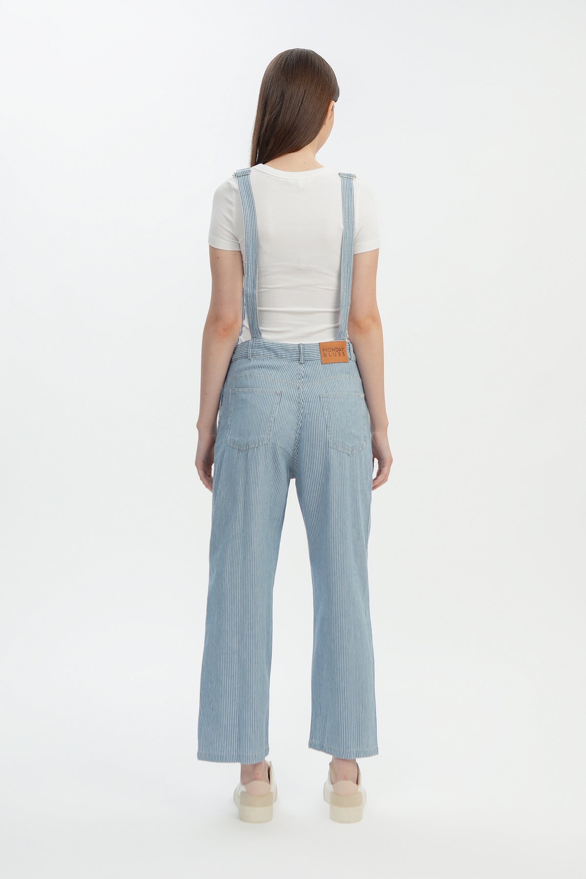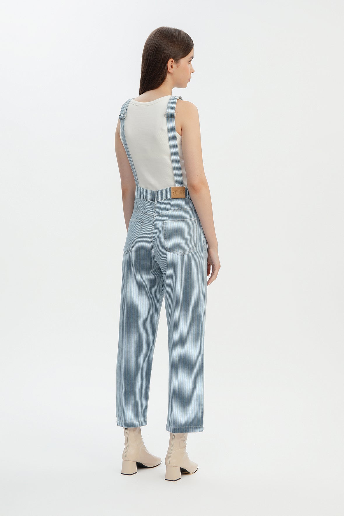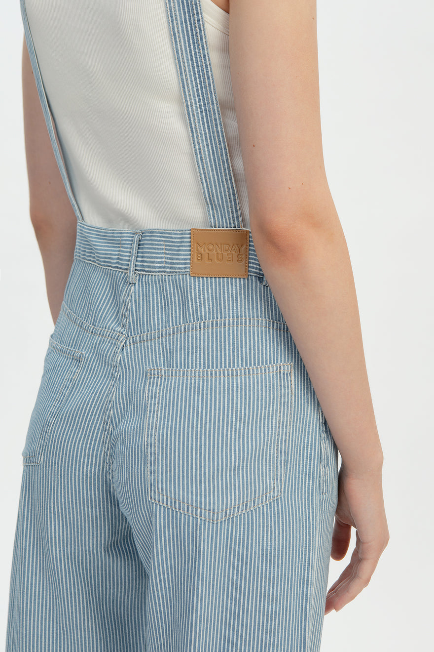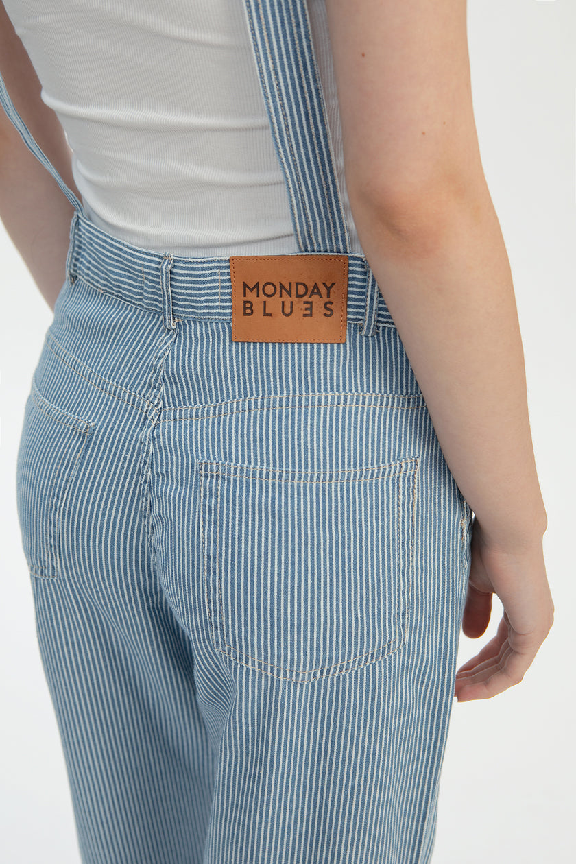 Meet our lightweight stripey denim overalls, cute and chic, our Pinstripe Denim Overalls. Crafted from a special striped weaved non-stretch denim this piece is unique and comfortable to move around in. This nostalgic piece features front, side and back pockets, available in light blue vertical pinstripes, with option of dark or light vegan leather patch