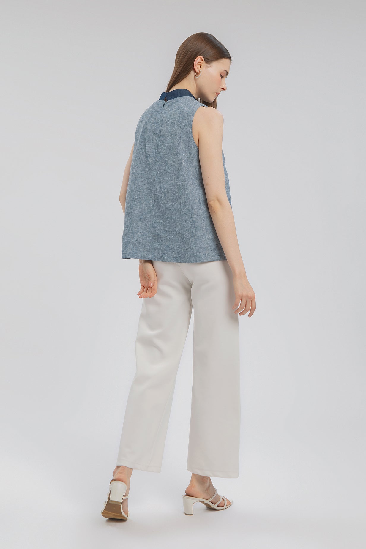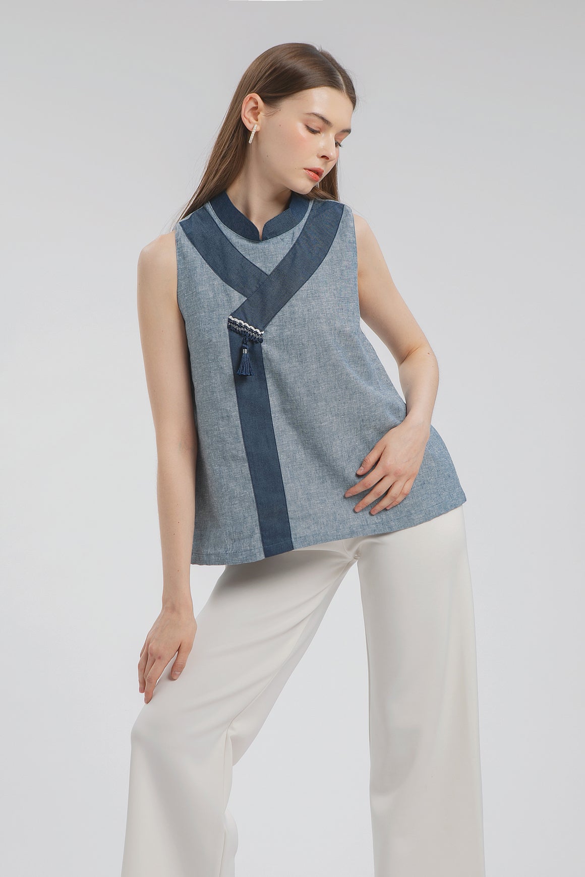 Features a clean silhouette with unique denim accents and a chinese tassel for a modern twist on a Chinese Cheongsam top. A fusion of tradition and modernity made with a Shanghai collar.